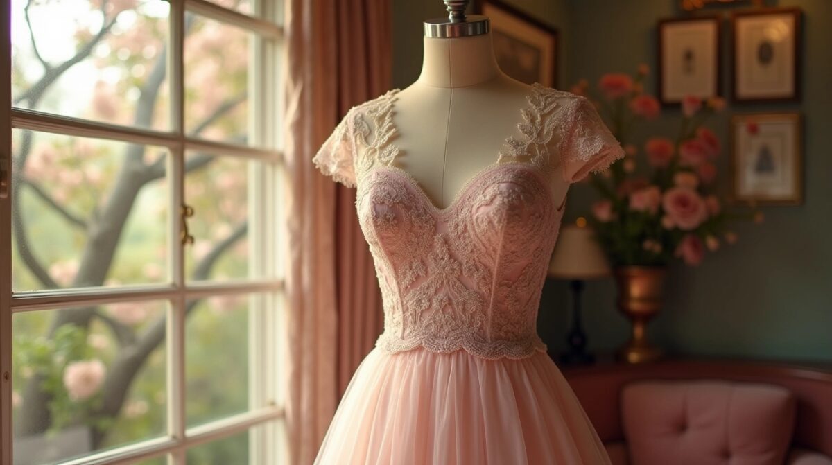 Une lumière dorée effleure les cintres alignés, où les robes attendent en silence. Dans cette chambre encore endormie, les teintes poudrées de rose flottent comme des promesses : celle d’un…