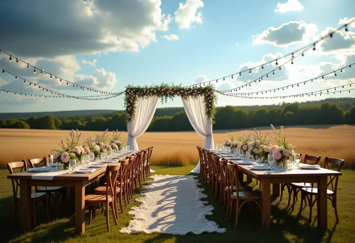 Les mariages champêtres, empreints de romantisme et de simplicité, séduisent de plus en plus de couples en quête d’authenticité. L’idée est de s’inspirer de la nature et de créer une atmosphère douce et chaleureuse, en harmonie avec les éléments naturels. Pour cela, rien de tel que des matériaux bruts comme le bois, la toile de jute ou encore les fleurs des champs.