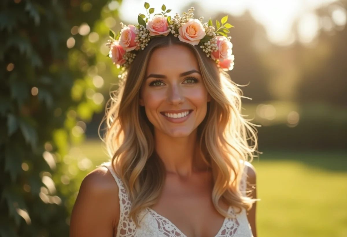 Coiffure pour mariage mi-long : couronnes de fleurs pour une touche bohème